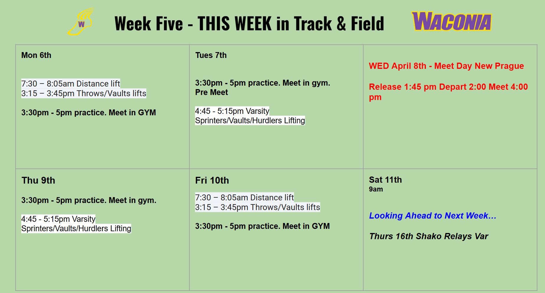 Friday ALL athletes, minus those competing at Wayzata are helping with the middle school meet at WHS track. Meet starts at 4pm.