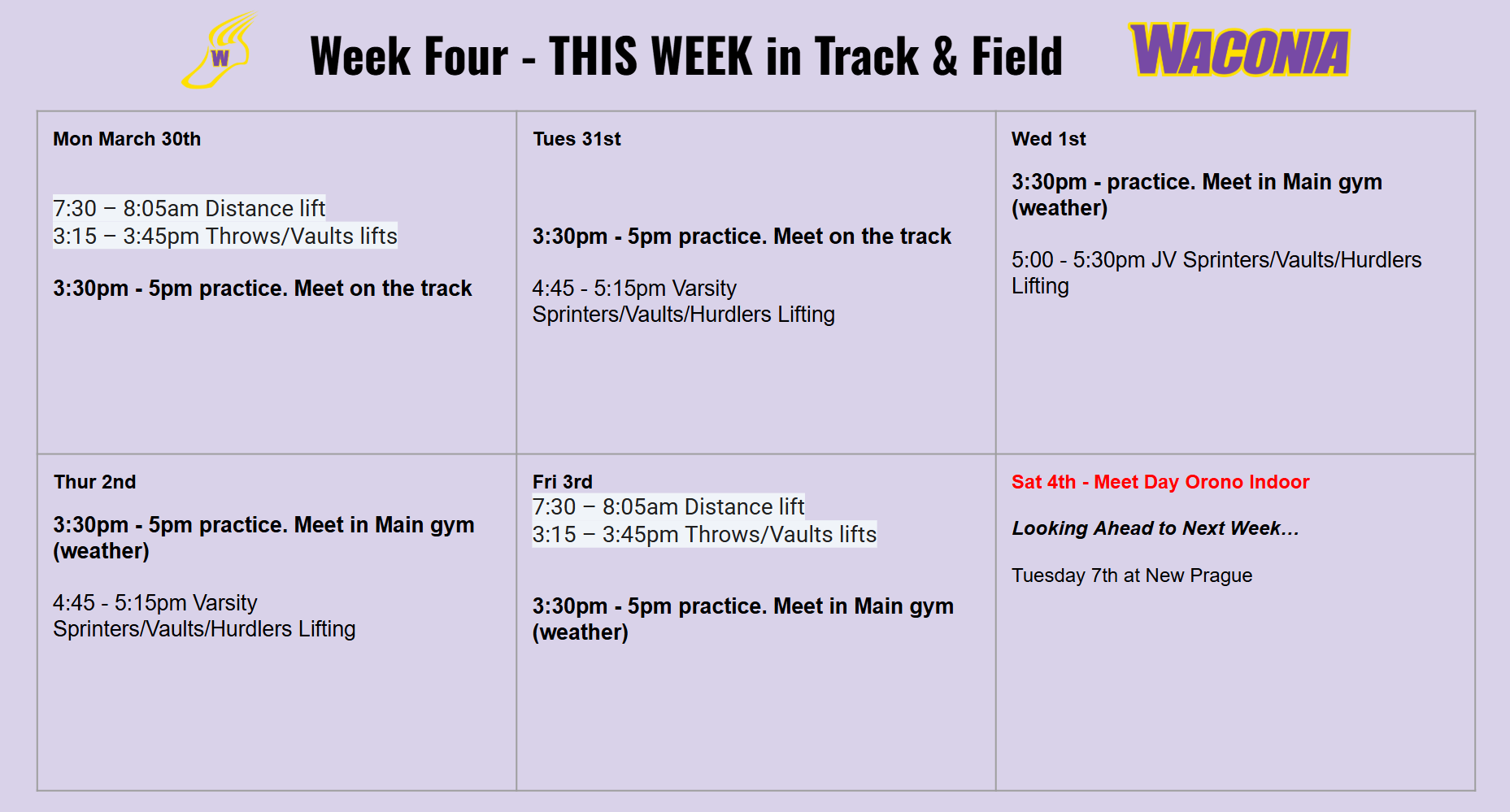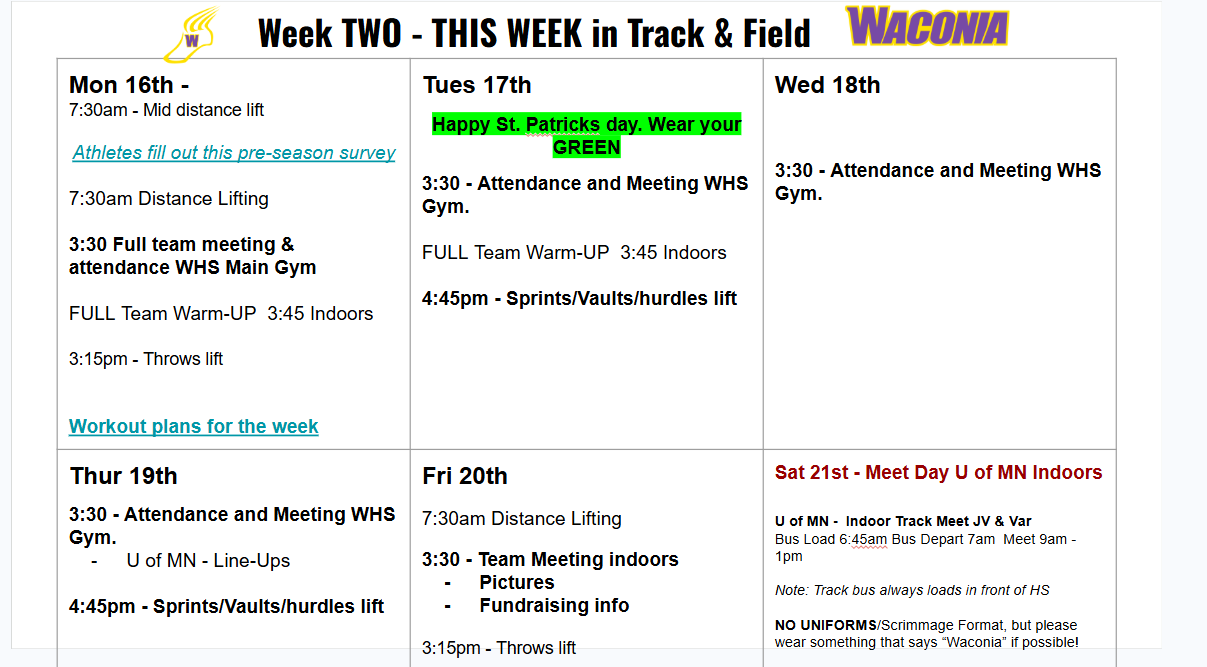 Saturday: University of MN - Indoor meet. 9am. Bus leaves at 7am from WHS.