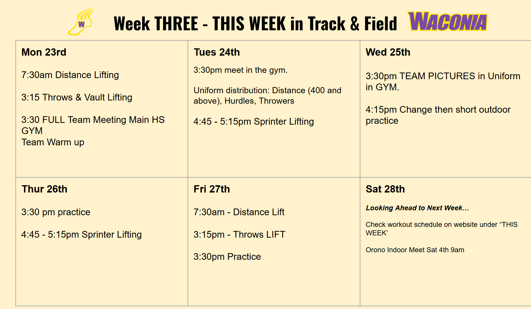 Weekly practice schedule - meet in Main Gym, unless we send a note on Sports You to meet on the track.