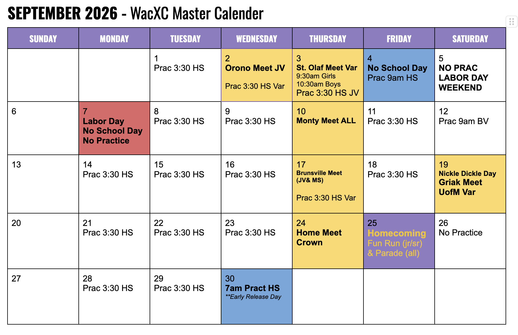 2025 Waconia XC Master Schedule